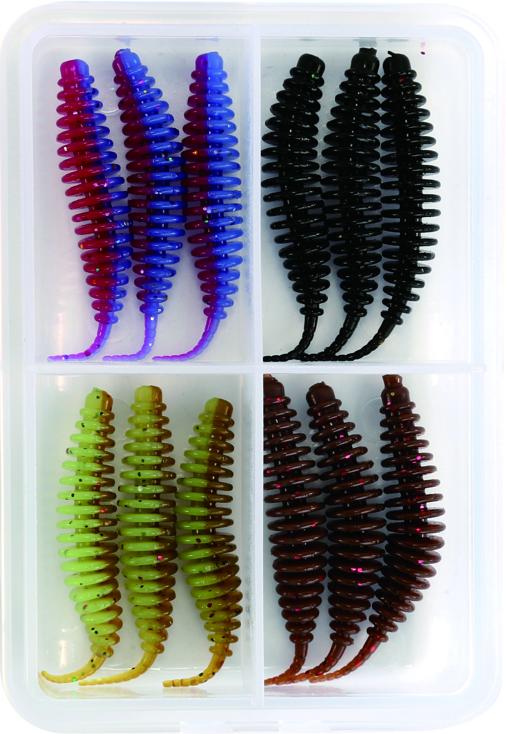Die preisgünstige Variante „Colorado Ecoworm“ wird als Mix in 4 verschiedenen Farben und 2 Größen angeboten. Diese soften, beweglichen Gummiköder sind natürlich auch aromatisiert (Squid Taste – salted). Geliefert wird dieser Köder in einer handlichen, wasserdichten Transportbox.