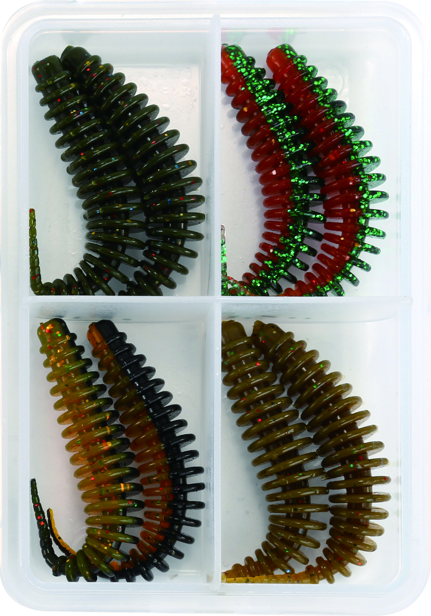 Die preisgünstige Variante „Colorado Ecoworm“ wird als Mix in 4 verschiedenen Farben und 2 Größen angeboten. Diese soften, beweglichen Gummiköder sind natürlich auch aromatisiert (Squid Taste – salted). Geliefert wird dieser Köder in einer handlichen, wasserdichten Transportbox.