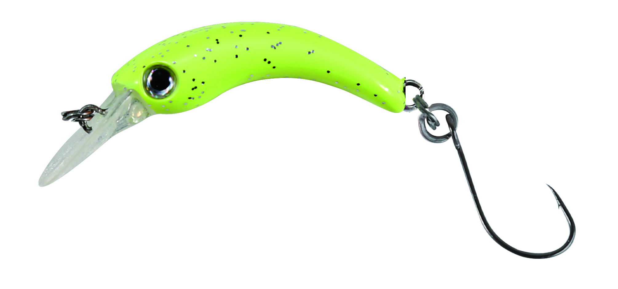 Curvy Wobbler mit 2 Einzelhaken – Als weiteren Trend in der Ul-Fischerei kristallisiert sich die Curvy Wobblerserie heraus. Diese Serie zeichnet sich durch ihr äußerst aktives Laufverhalten aus, welches auch besonders träge Fische anspricht. Gewicht: 3,1 g, Größe: 4,2 cm, Action: sinkend, Farbe: fluogelb-glitter